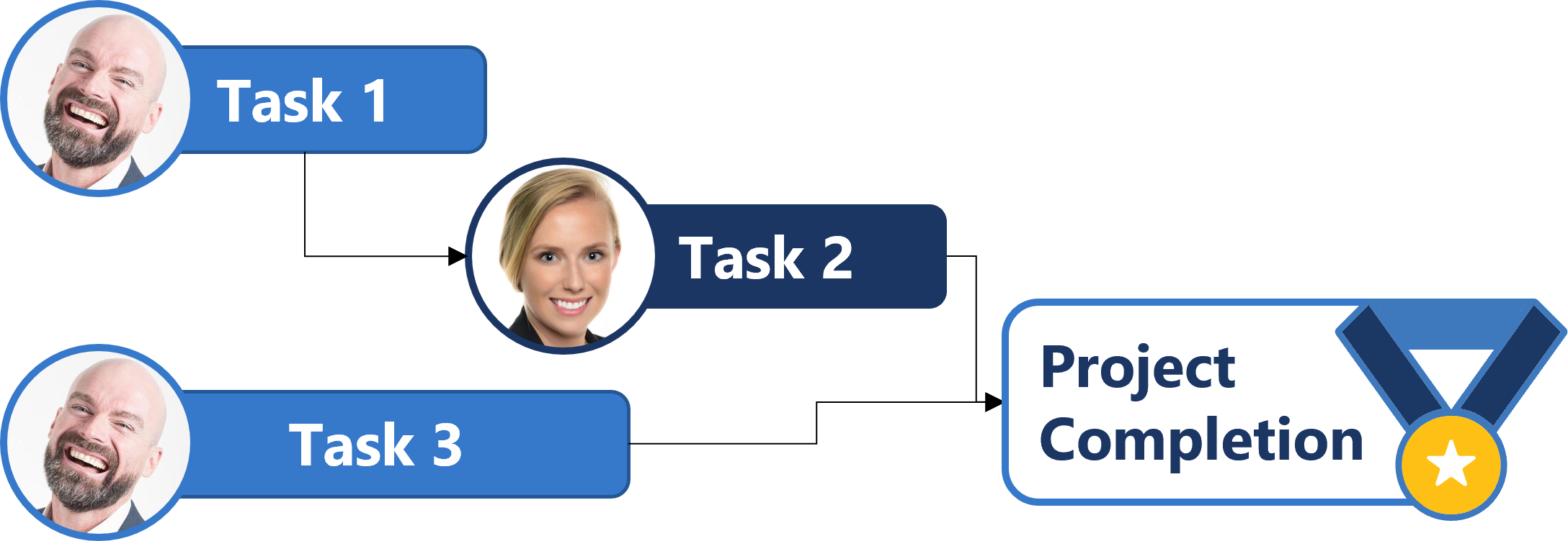 CCPM diverges from the more traditional Critical Path Project Management approach that determines the total duration of a project according to the time required to execute the longest sequence of tasks. Unlike Critical Path, CCPM includes both logical and task dependencies to account for resource constraints and activity interdependencies (see figures below). Consequently, CCPM emphasizes managing resources, not just tasks, and the priority shifts onto the Critical Chain.